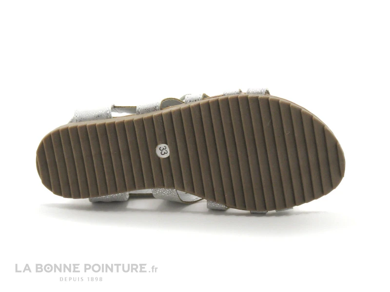 Cette chaussure enfant est argent pailletĂ©, avec un lacet gris qui traverse 4 oeillet et permet d’ajuster la sandale spartiate au pied de l’enfant.