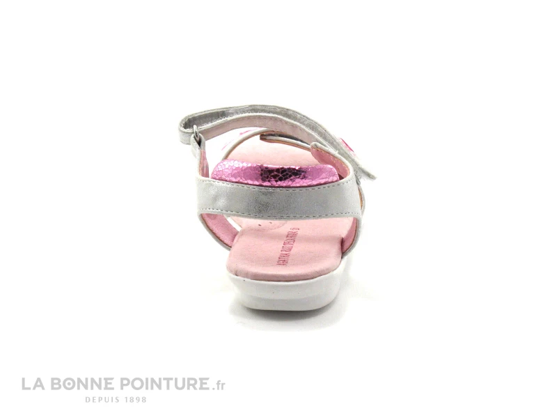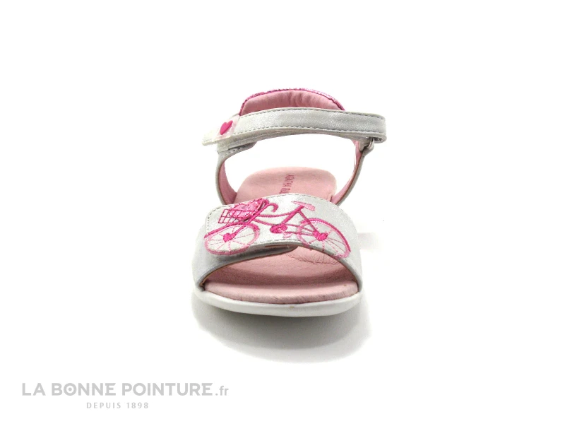 Cette sandale d’été est gris métallisé, avec un empiècement rose métal à l’arrière, un un vélo (rose aussi !) brodé sur le devant.