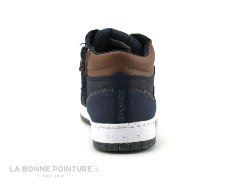 Cette chaussure montante garçon Alma Planète est bleu marine, avec une petite touche de marron camel Ă l’arrière.