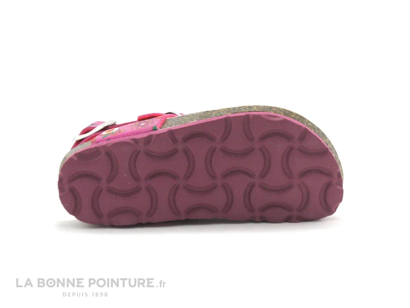 Cette chaussure d’Ă©tĂ© fillette est en simili cuir rose fuchsia Ă petites fleurs.