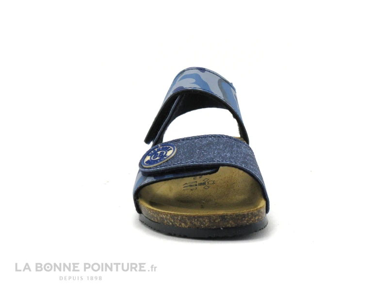 Ces sandales enfant sont en simili cuir bleu jean, avec un imprimé camouflage gris et bleu.
