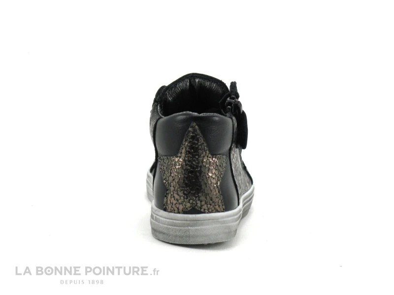 Cette basket montante fille Bopy mélange un cuir lisse noir avec un cuir imprimé or sur les côtés.