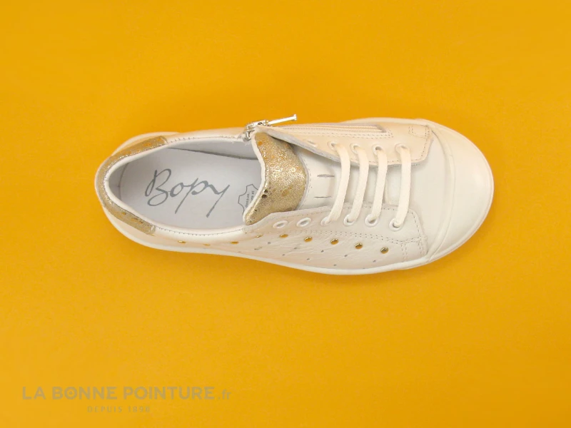 La semelle de marche des baskets Bopy Sava est blanche avec un liseré doré, avec bout renforcé pour limiter l’usure.