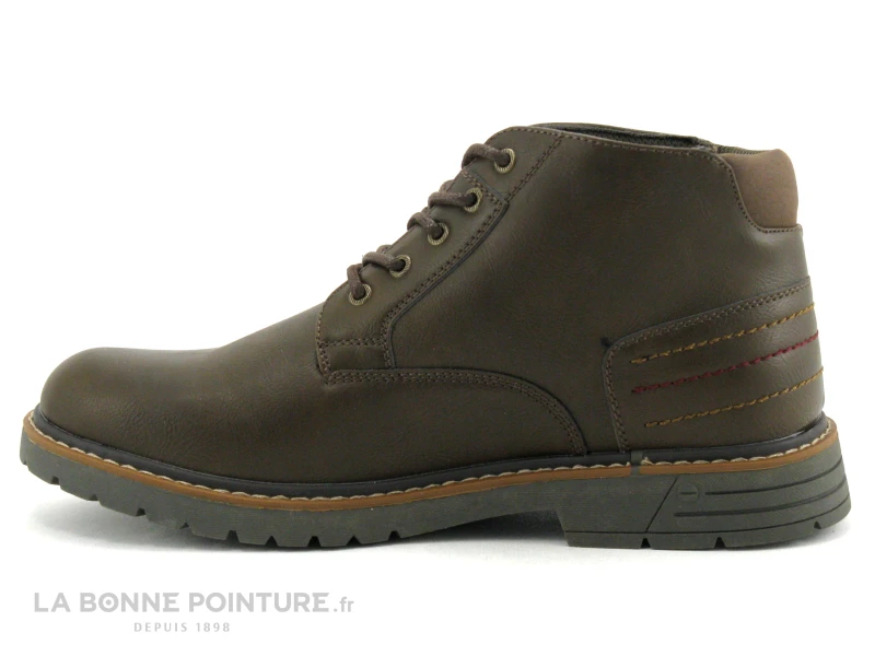 Ces bottillons Ă lacet Homme  Broker & Co sont en simili cuir marron foncĂ©, avec de discrètes coutures camel et bordeaux Ă l’arrière.