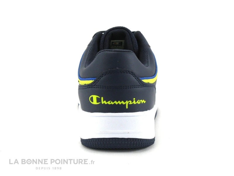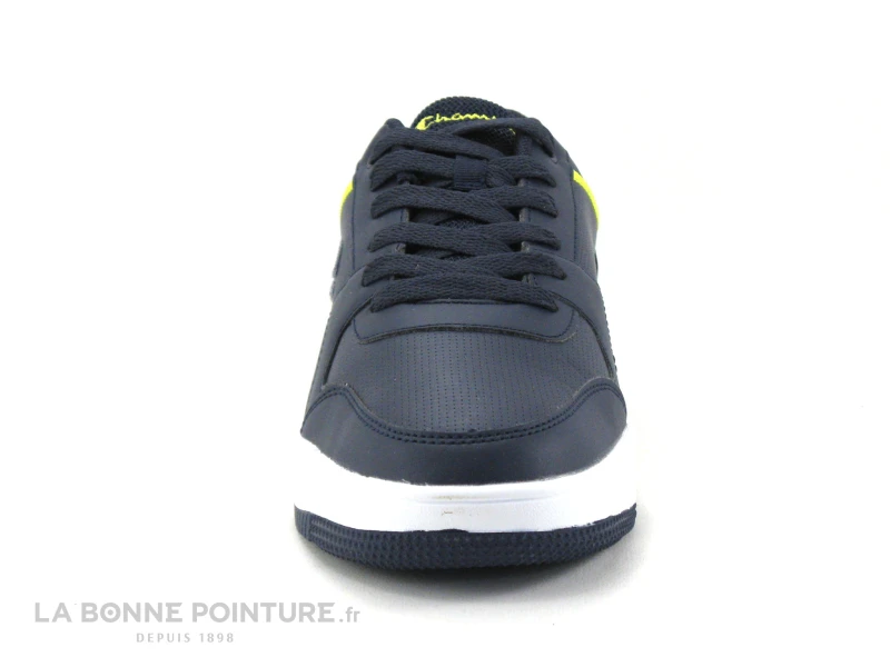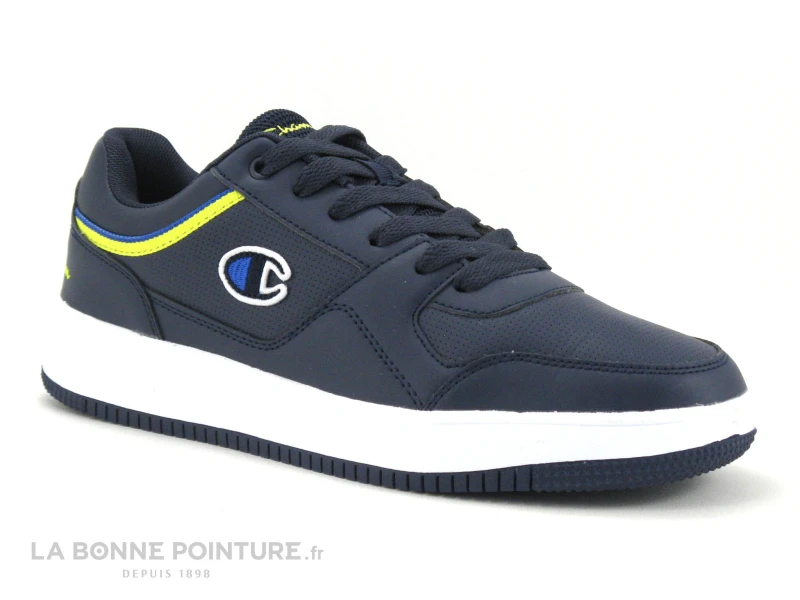 Cette basket de ville Homme Champion est en simili cuir bleu marine, avec des lignes jaunes et bleu royal sur les côtés.