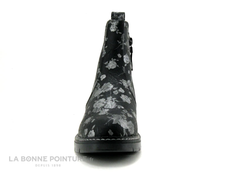 Cette bottine Dockers Femme est en simili noir aspect légèrement froissé, imprimé de fleurs aux tons de gris argenté et de doré.