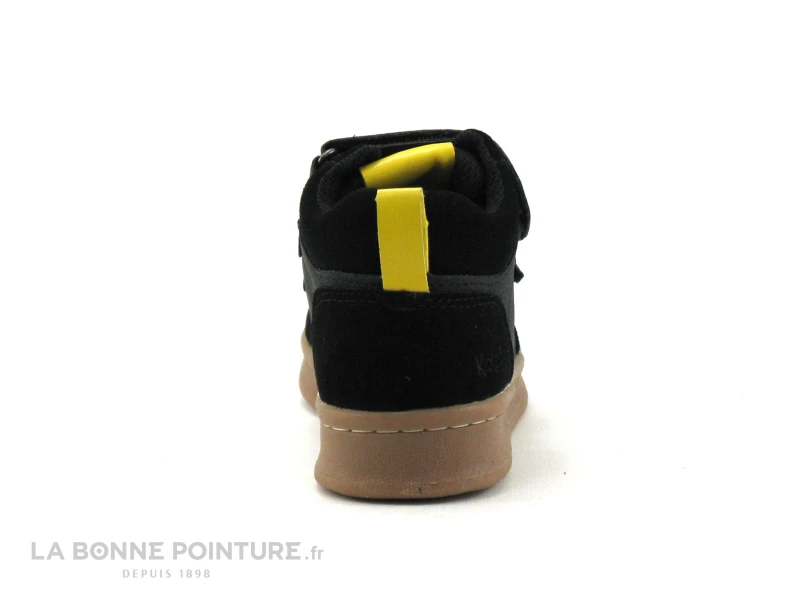 Cette chaussure montante enfant Kickers Bilbon est noire avec un peu de jaune et de rouge.