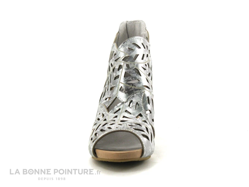 Ce nu-pieds à talon haut Laura Vita est en cuir gris acier, aux reflets métallisés avec la tige joliment perforée.
