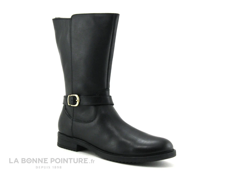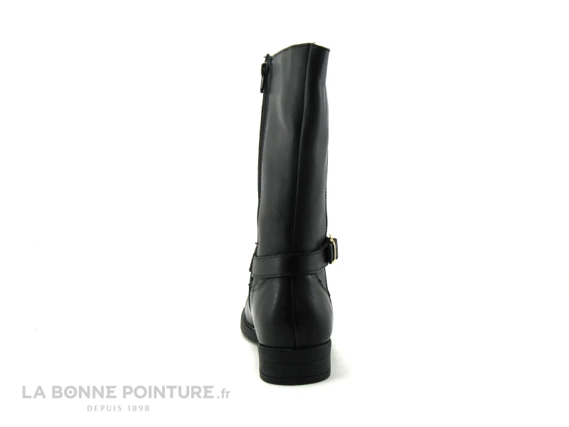 Cette botte fille est en cuir lisse noir, ornĂ©e d’une bride autour de la cheville avec une boucle dorĂ©e.