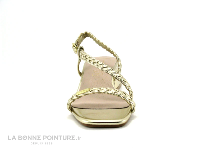 Une lanière étroite tressée or enveloppe l’avant du pied, tandis qu’une seconde traverse le coup de pied en enrobant le talon.