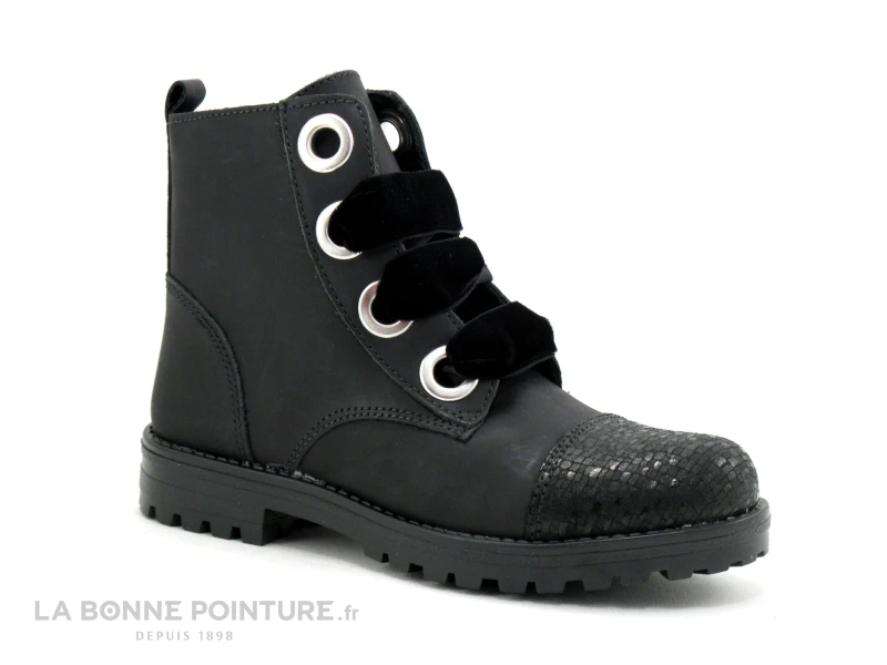 Cette bottine est en cuir noir Ă l’aspect mat, avec l’avant en cuir veloutĂ© effet craquelĂ©.