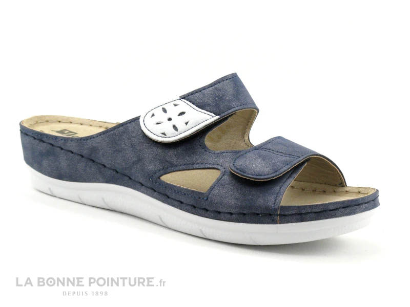 Cette mule est bleu mĂ©tallisĂ©, avec un peu de gris sur l’une des brides.