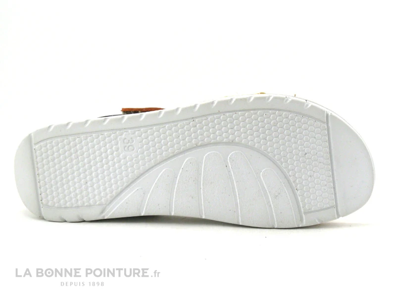 Cette sandale Femme pas chère Moran’s est en cuir bleu marine, jaune et orange, non doublé pour gagner en souplesse.