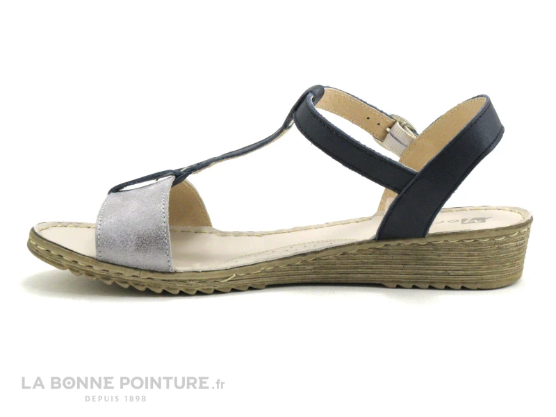 Cette sandale combine un cuir lisse bleu marine et un cuir velours gris métal.