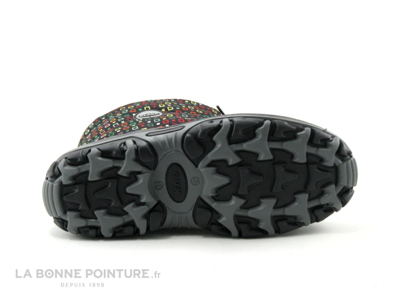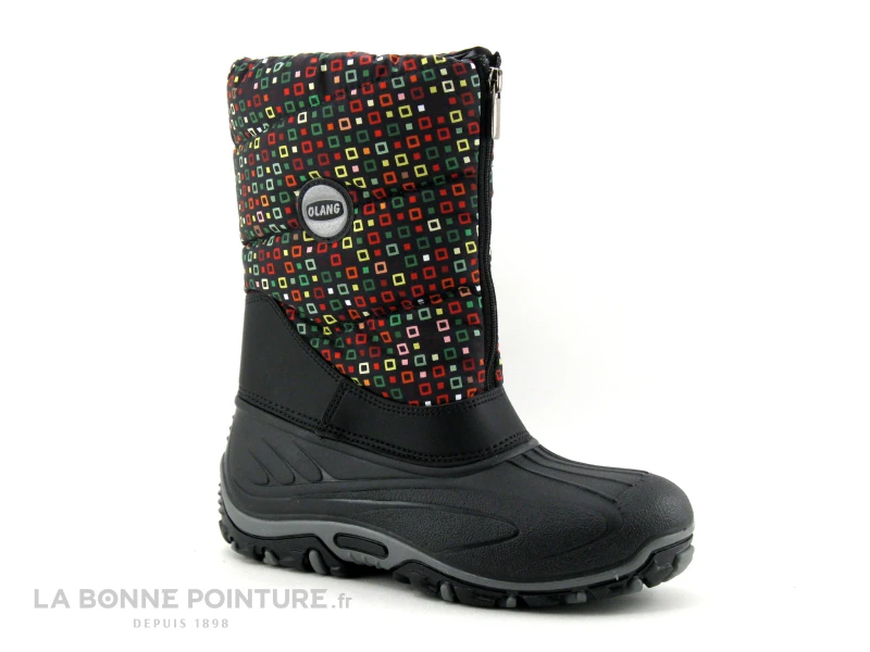 Le haut des boots neige est en textile nylon imprimé de petits carrés multicolores sur fond noir.