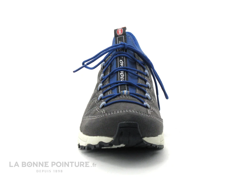 Cette basket randonneurs est principalement en cuir velours gris foncé, avec un textile bleu foncé au niveau de l’encolure et sur le dessus.