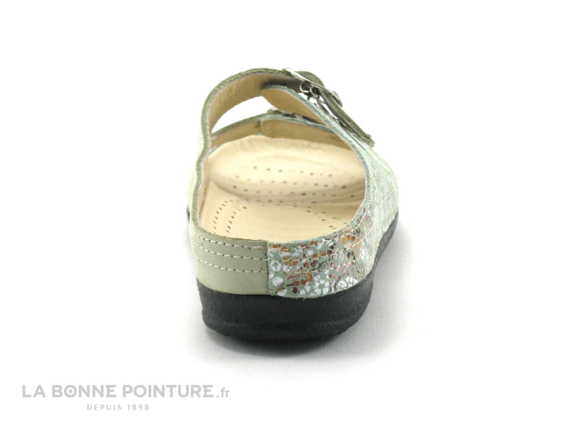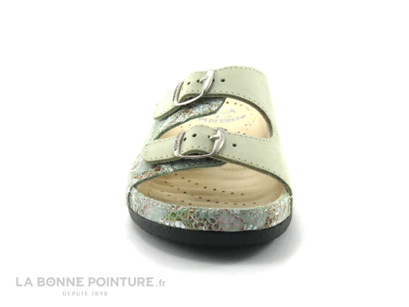 Cette mule confort Femme Pedi Girl Well mélange un cuir velouté vert amande (kaki très clair) et un cuir imprimé floral, avec une petite touche argentée.