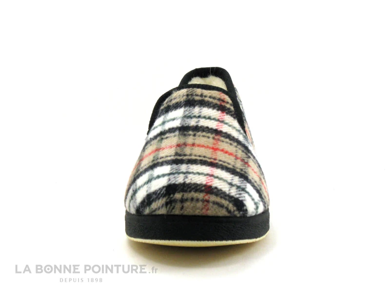 Ce chausson Homme Semelflex est en textile écossais aux tons de beige, de blanc cassé et de noir, avec de fines rayures rouges et vertes.