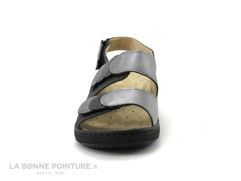 Ce nu-pieds Femme Semelflex Gisele 2 est majoritairement en cuir, avec des parties veloutées et gris métallisé.