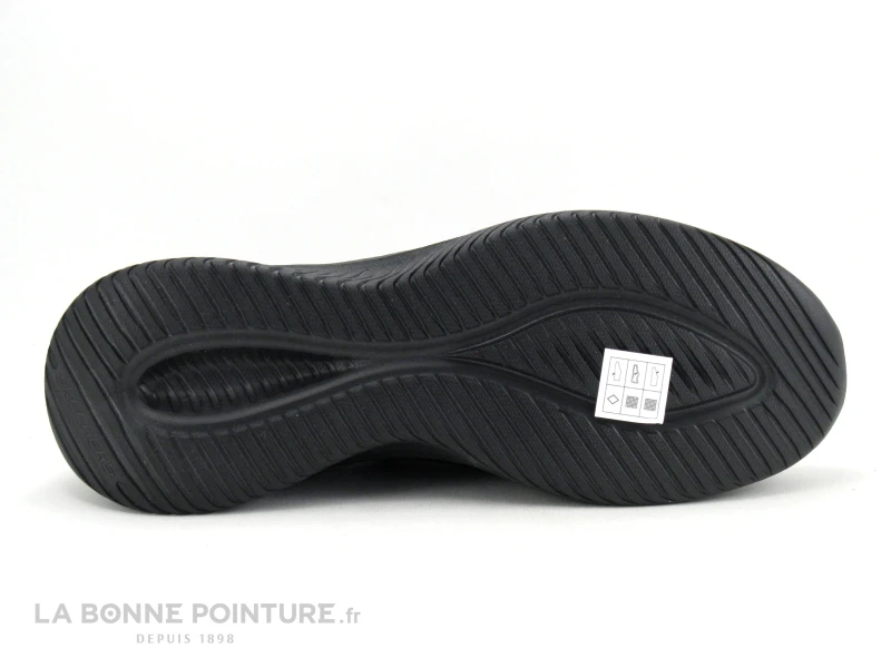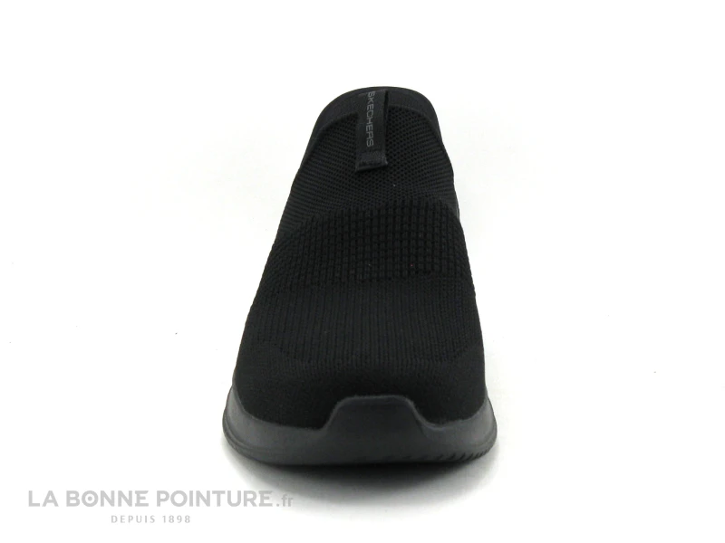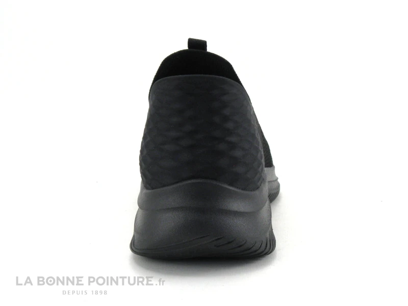 Cette basket sans lacet et vegan Skechers 232450 Ultra Flex Smooth step est en maille stretch noire.