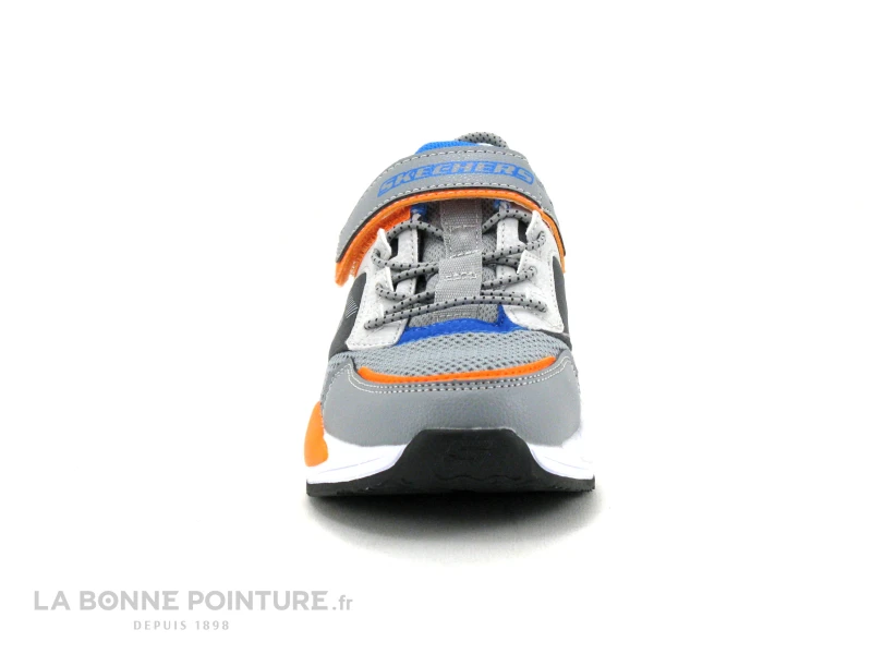 Ces sneakers Skechers enfant sont en textile et matières synthétique gris, avec des touches de turquoise, d’orange, de jaune et de noir.