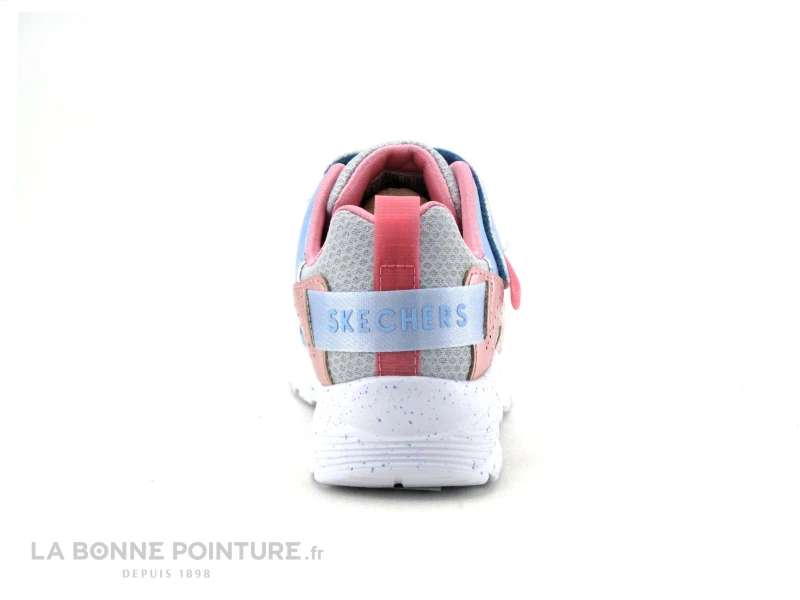 Cette basket enfant lavable en machine Skechers Uno Lite est en textile et matiÚres synthétiques résistantes aux tons de bleu ciel et de rose métallisé, avec du gris argent.