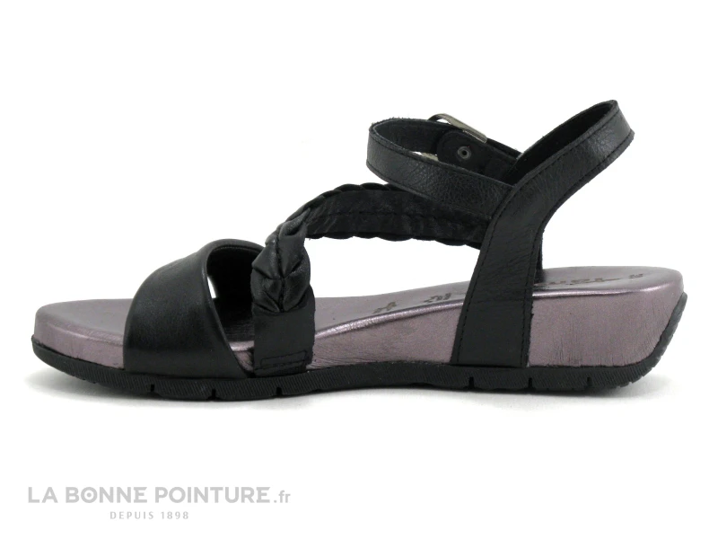 La semelle de marche des sandales noires Tamaris est flexible, avec un talon compensĂ© gris mĂ©tallisĂ© d’environ 4 cm.