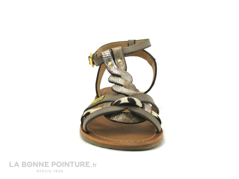 Ce nu-pieds Femme est en cuir beige taupe et beige métallisé façon lézard. Une lanière avec des poils couleur léopard caractérise un peu plus la plagette Tropeziennne Hams.