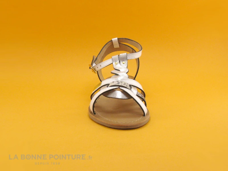Ce nu-pieds Femme mĂ©lange un cuir argentĂ©, un cuir blanc façon lĂ©zard et un cuir gris python, avec des lanières dĂ©licatement entrelacĂ©es sur l’avant.