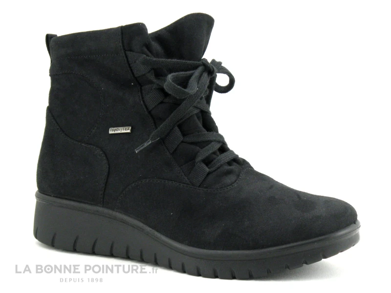 Ces boots d’hiver Femme sont en amaretta noir, un textile résistant au bel aspect velouté.