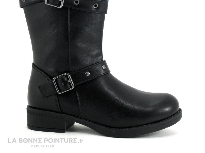 Cette botte fille Wipop est en simili cuir noir aspect veiné, avec des lanières ornées de clous et d’oeillets argentés.